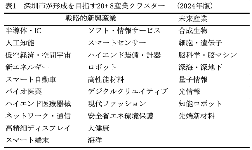 地方政府が実施している産業振興の方策として特に効果的だとみられるのが、有力な企業や研究機関などを核として同業や関連業種の企業を誘致して産業クラスターを形成する政策である。例えば深圳市は2022年に戦略的新興産業の拡大発展と未来産業の育成を目指す政策を発表し、市内に20カ所の戦略的新興産業のクラスター、8カ所の未来産業のクラスターを形成する方針が打ち出された。2024年には戦略的新興産業と未来産業を一部入れ替えた新たなリストが発表された(表1)が、これを見るとデジタルクリエイティブ、現代ファッション、大健康(包括的健康)などの中央政府が掲げた「戦略的新興産業」には含まれていない産業も入っている。つまり、地方政府が中央の方針を参照しつつも、ある程度の自由度をもって産業を選んでいることがわかる。